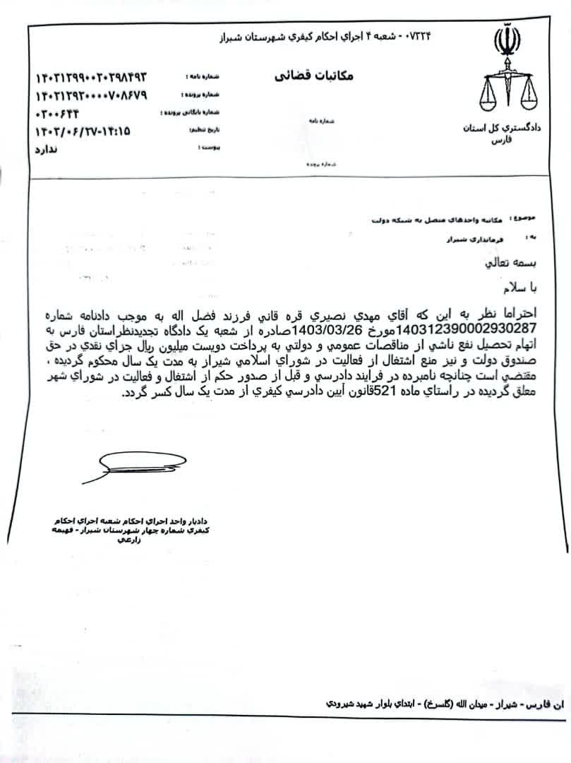 به گزارش طریق پرس از شیراز، اجرای احکام در تاریخ ۲۷ شهریور پاسخ استعلام فرماندار شیراز را مبنی بر تفسیر رای مهدی نصیری عضو شورای شهر را داده است که ادعای بسیاری از حقوق دانان و خود ایشان مبنی بر اینکه در زمان صدور رای دادگاه در سوم مرداد به شورا بر می گشتند را اثبات کرد.