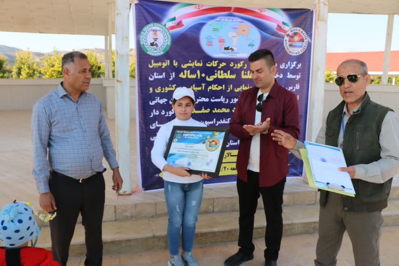 مراسم ثبت رکورد حرکات نمایشی با اتومبیل توسط هلنا سلطانی ( ده ساله) با حضور ریاست محترم سازمان جهانی ورزش ورزشهای آبی استاد محمد صفدری رکورد دار جهان ونماینده رسمی ثبت رکوردهای جهانی کنفدراسیون و کمپانیهای چند جانبه ایمارو، ایمارو اسپرت و ورزشهای جهانی همگانی تافیسا در استان فارس شهرستان کازرون انجام شد.