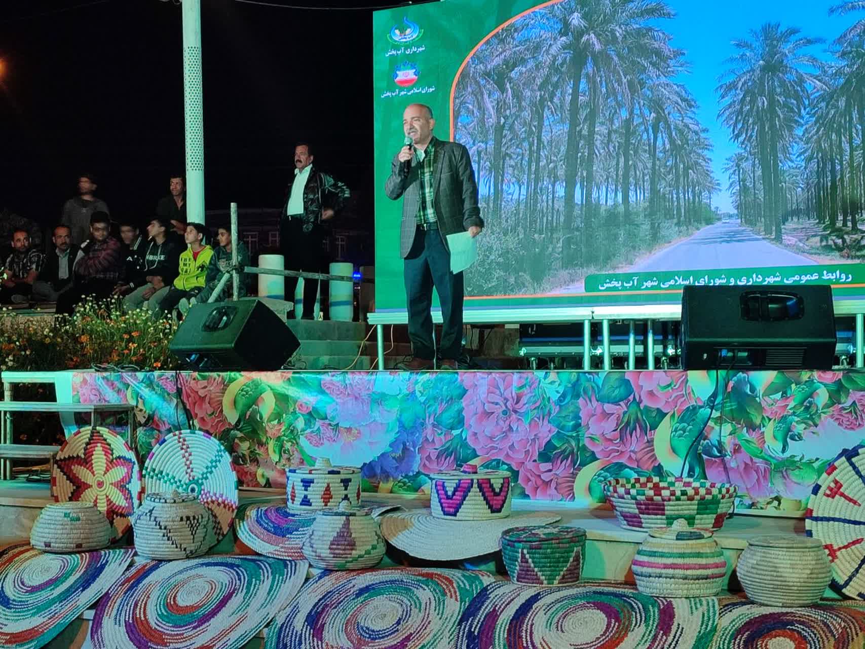 مهندس جامعی بیان داشت: خوش بختانه آب پخش به واسطه وجود نخلستان های انبوه و نهرهای روان آب و طبیعت بکر و زیبا به یکی از برترین نقاط توریستی استان و حتی کشور تبدیل شده تا جائیکه به نگین سبز استان بوشهر شهرت یافته و از سوی وزارت میراث فرهنگی به عنوان شهر ملی حصیربافی ایران ثبت شده لذا می بایست با تلاش و برنامه ریزی زمینه رشد و توسعه پایدار شهر را فراهم کنیم و به شهر جهانی حصیربافی تبدیل شویم و این مهم نیازمند ایجاد زیرساخت های لازم است که ما در مدیریت شهری تلاش می کنیم و همچنین همت بلند مردم هنرمند و هنرپرور جهت تحقق این هدف لازم است.