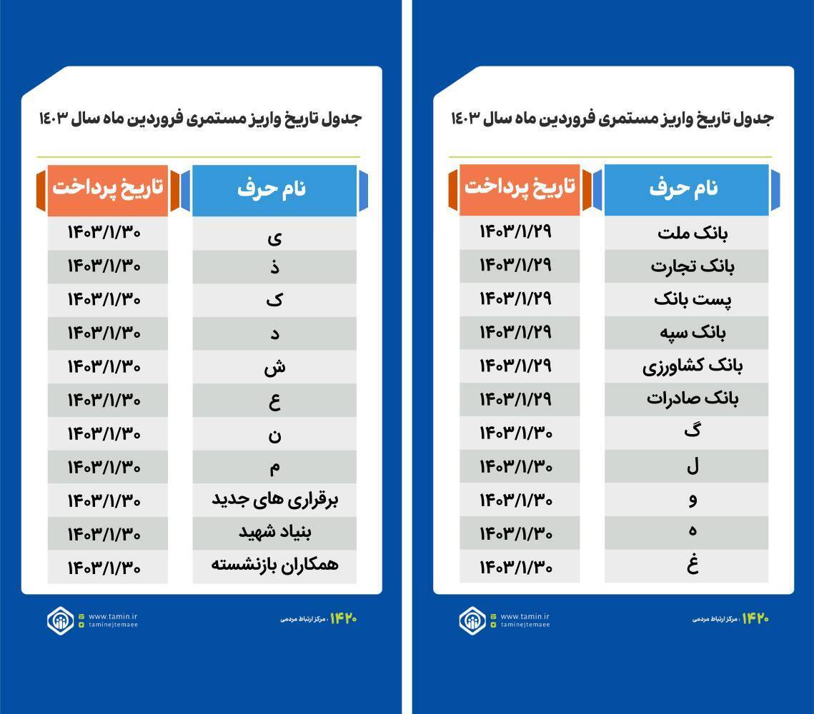 اعلام جدول پرداخت حقوق بازنشستگان تأمین اجتماعی در فروردین‌